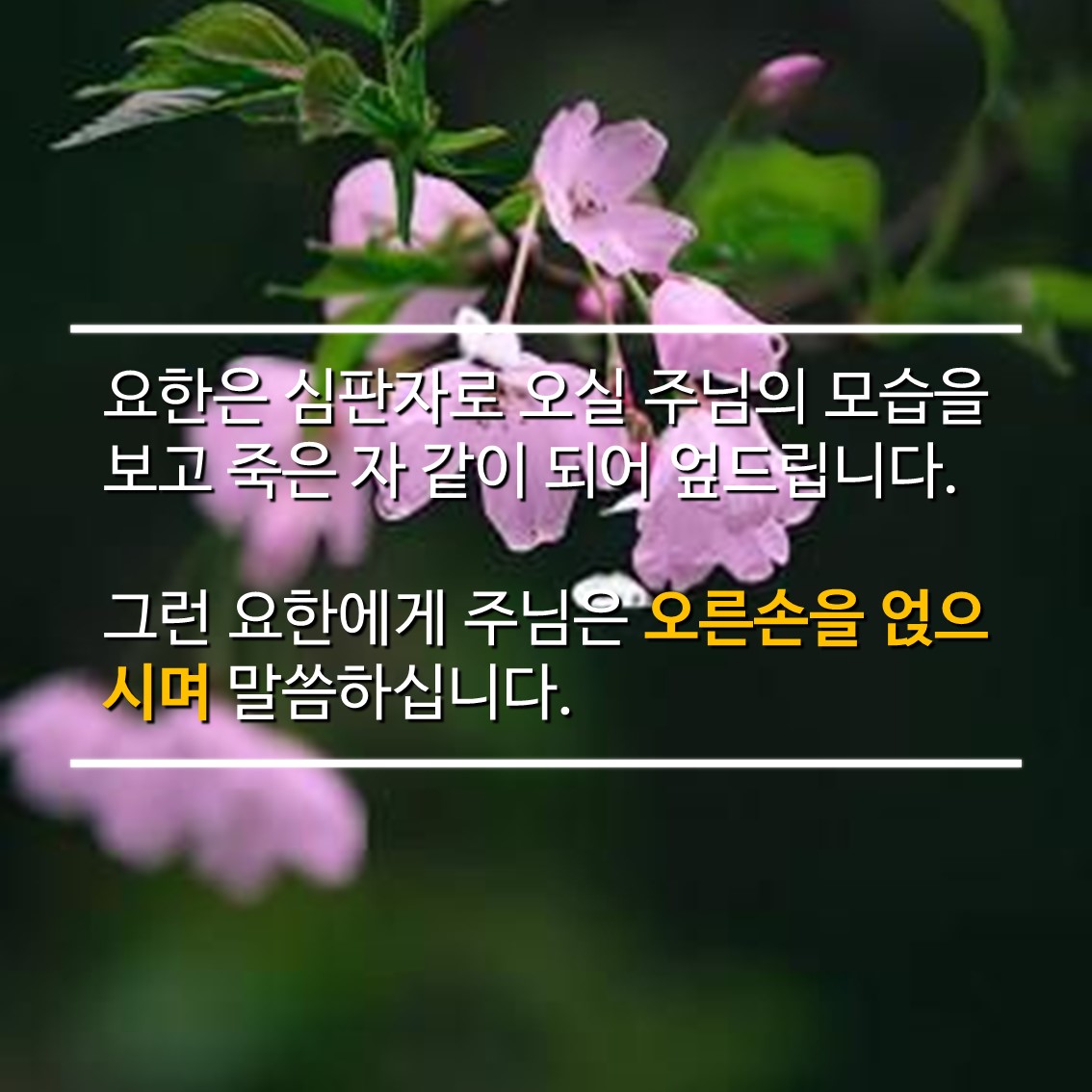 요한은 심판자로 오실 주님의 모습을 보고 죽은 자 같이 되어 엎드립니다.