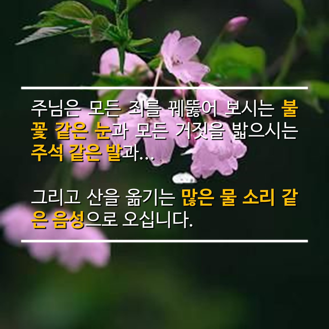 주님은 모든 죄를 꿰뚫어 보시는 불꽃 같은 눈과 모든 거짓을 밟으시는 주석 같은 발과...