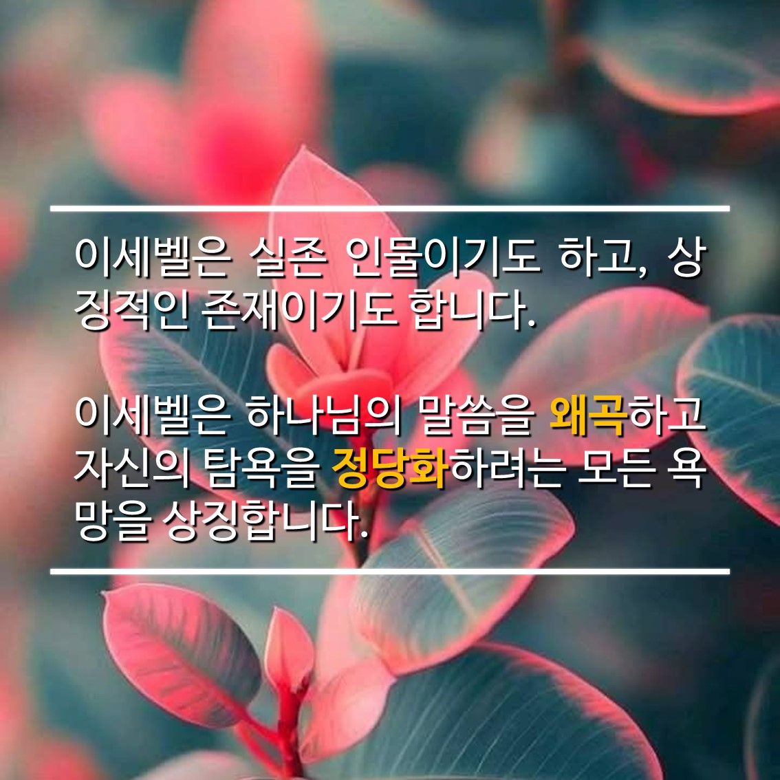 이세벨은 하나님의 말씀을 왜곡하고 자신의 탐욕을 정당화하려는 모든 욕망을 상징합니다.
