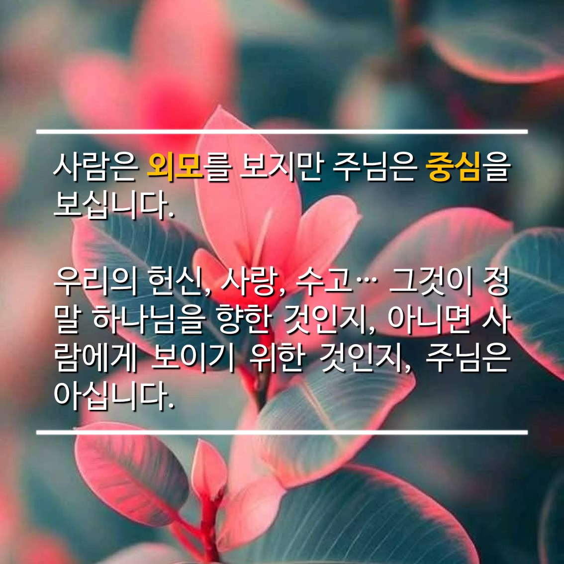 우리의 헌신, 사랑, 수고… 그것이 정말 하나님을 향한 것인지, 아니면 사람에게 보이기 위한 것인지, 주님은 아십니다.