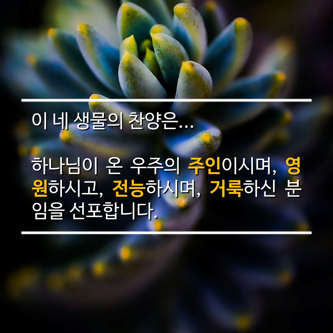 하나님이 온 우주의 주인이시며, 영원하시고, 전능하시며, 거룩하신 분임을 선포합니다.