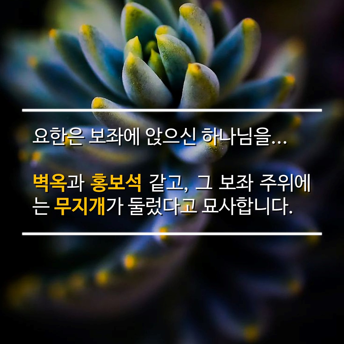 벽옥과 홍보석 같고, 그 보좌 주위에는 무지개가 둘렀다고 묘사합니다.