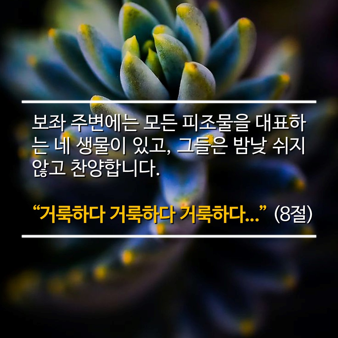 보좌 주변에는 모든 피조물을 대표하는 네 생물이 있고, 그들은 밤낮 쉬지 않고 찬양합니다.