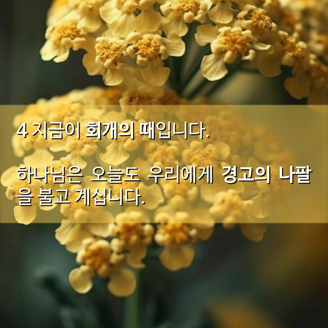 오늘이라는 날이 우리에게 주어진 이유는 ‘은혜의 기회’입니다. 나팔이 울리기 전에, 돌이키는 사람이 복된 사람입니다.