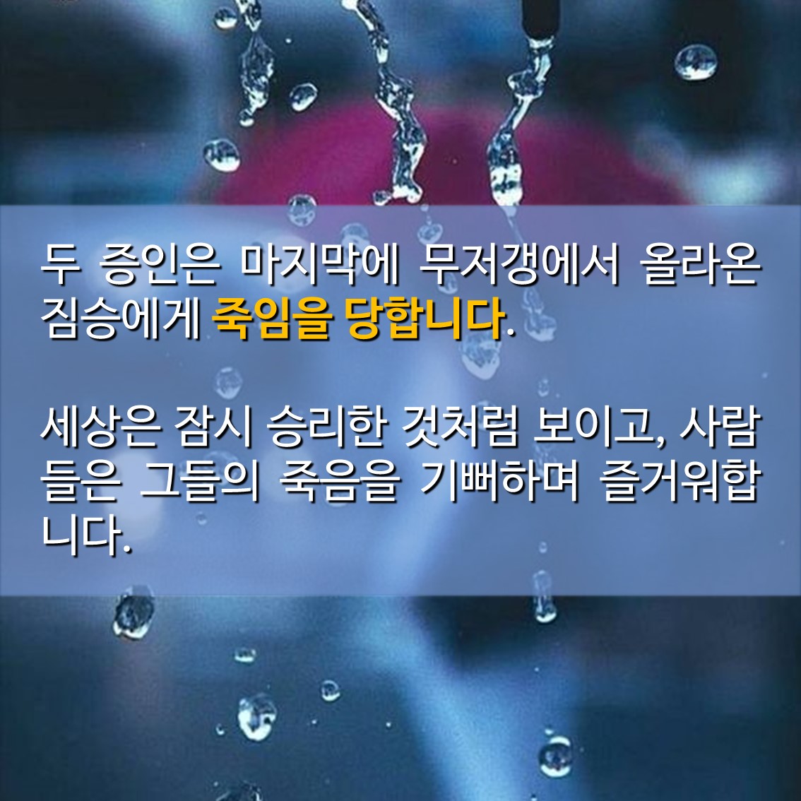 두 증인은 마지막에 무저갱에서 올라온 짐승에게 죽임을 당합니다.