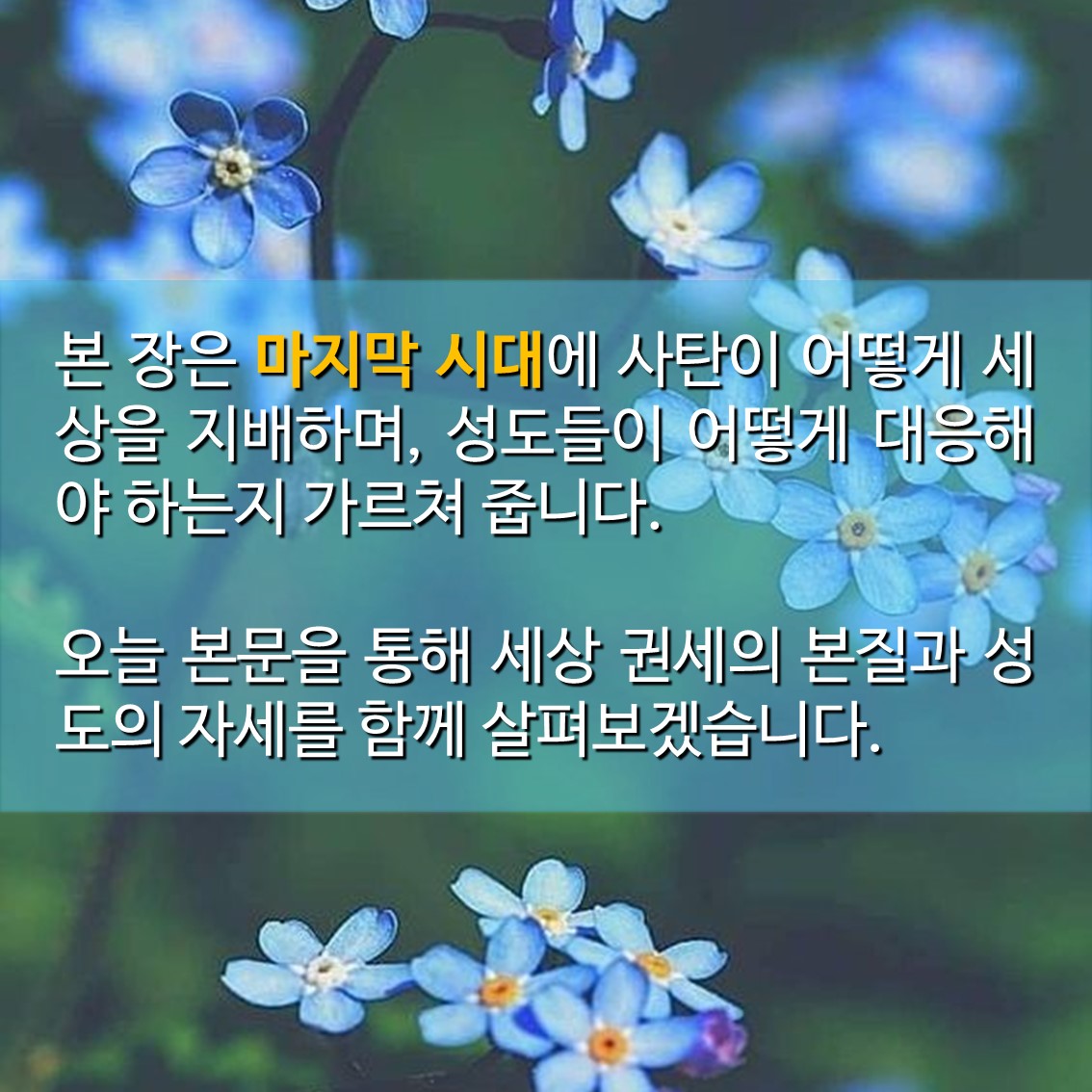 본 장은 마지막 시대에 사탄이 어떻게 세상을 지배하며, 성도들이 어떻게 대응해야 하는지 가르쳐 줍니다.
