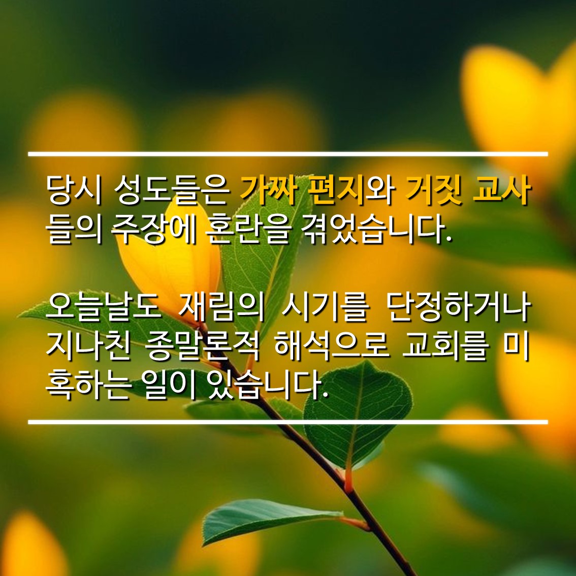 “영으로나 말로나 또는 우리에게서 받았다고 하는 편지로나 주의 날이 이르렀다고 해서 쉽게 마음이 흔들리거나 두려워하지 말라” (2절)