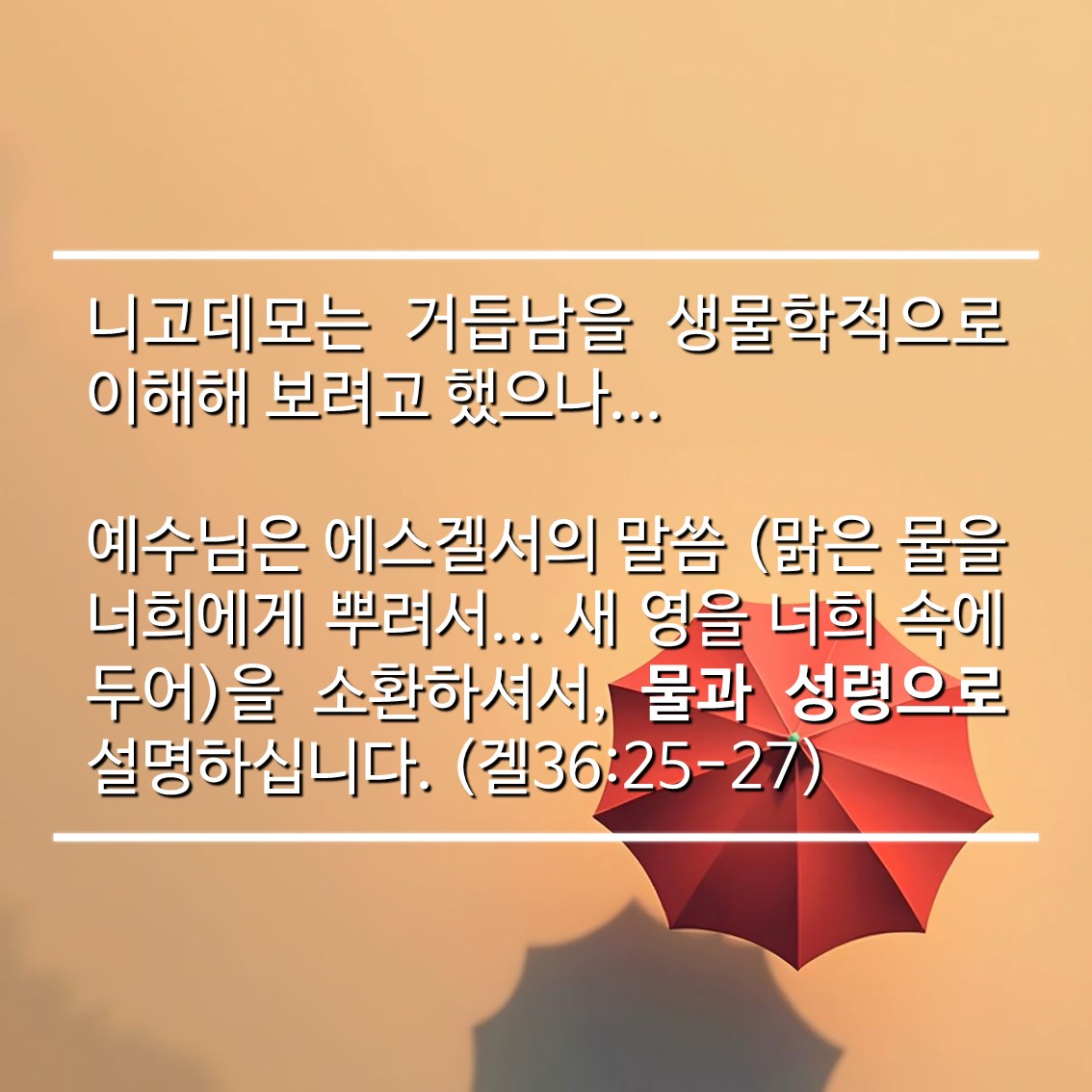 예수님은 에스겔서의 말씀 (맑은 물을 너희에게 뿌려서... 새 영을 너희 속에 두어)을 소환하셔서, 물과 성령으로 설명하십니다. (겔36:25-27)