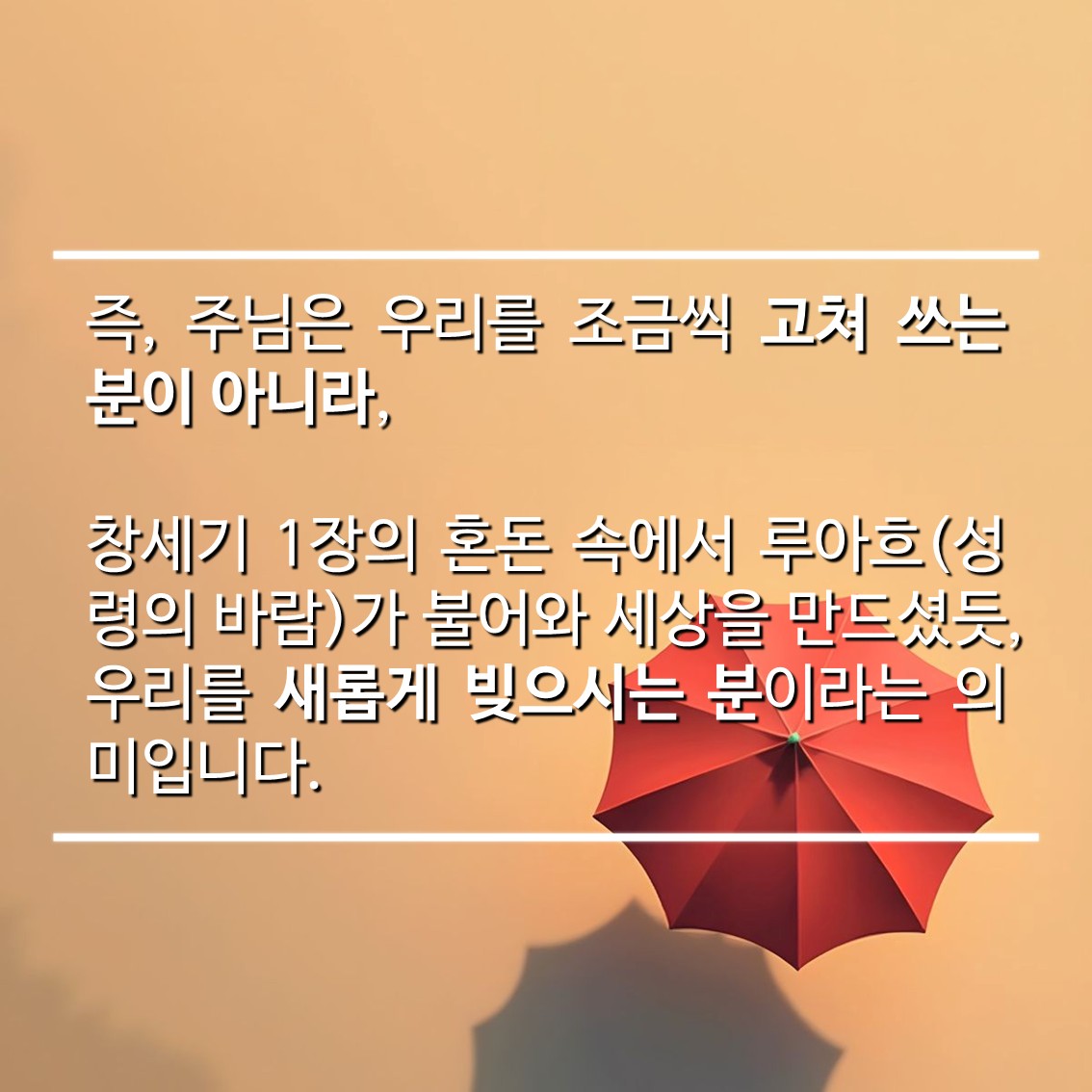 창세기 1장의 혼돈 속에서 루아흐(성령의 바람)가 불어와 세상을 만드셨듯, 우리를 새롭게 빚으시는 분이라는 의미입니다.