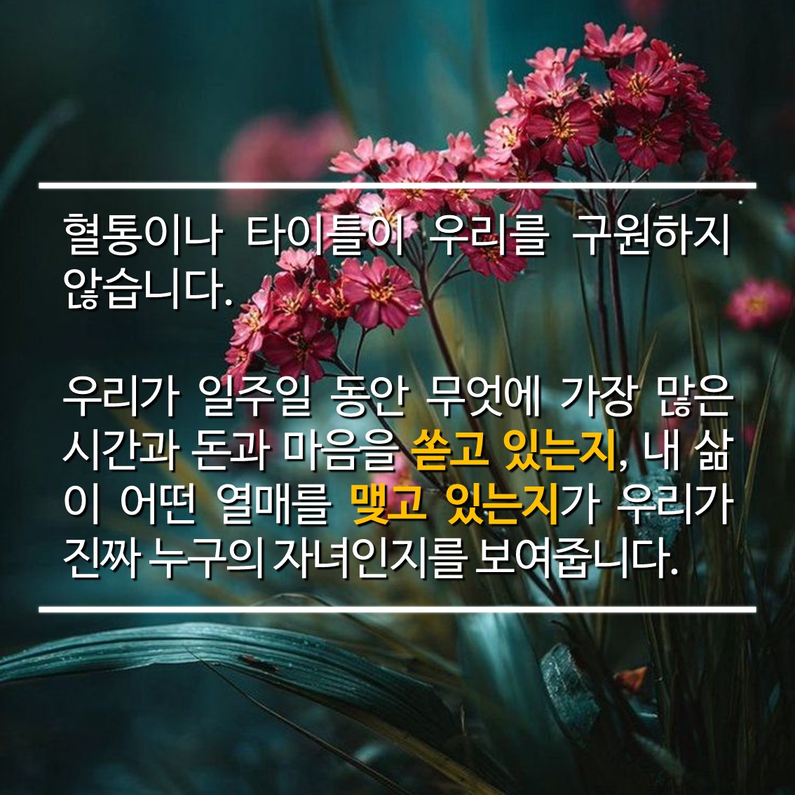 우리가 일주일 동안 무엇에 가장 많은 시간과 돈과 마음을 쏟고 있는지, 내 삶이 어떤 열매를 맺고 있는지가 우리가 진짜 누구의 자녀인지를 보여줍니다.