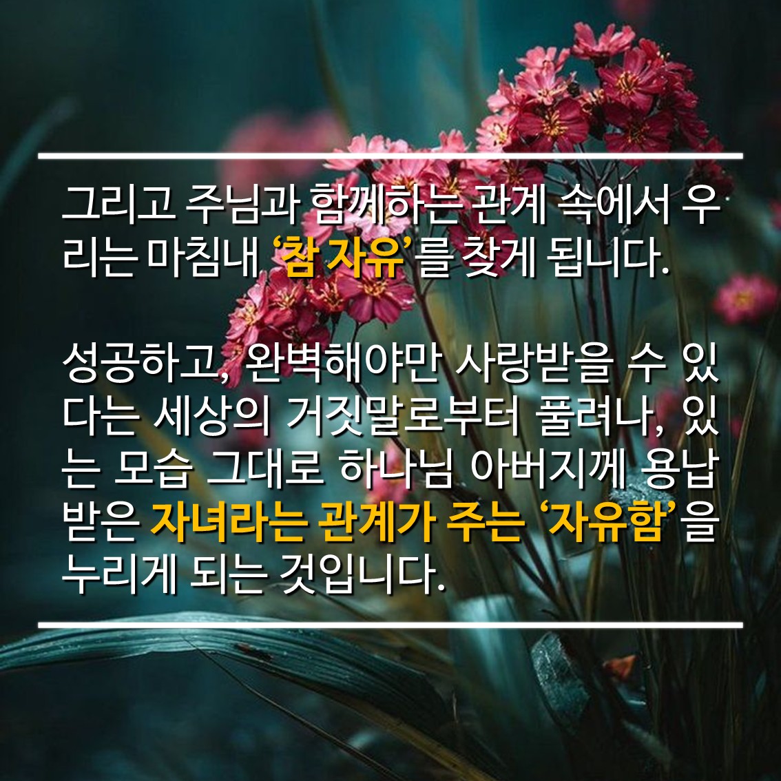 그리고 주님과 함께하는 관계 속에서 우리는 마침내 '참 자유'를 찾게 됩니다.