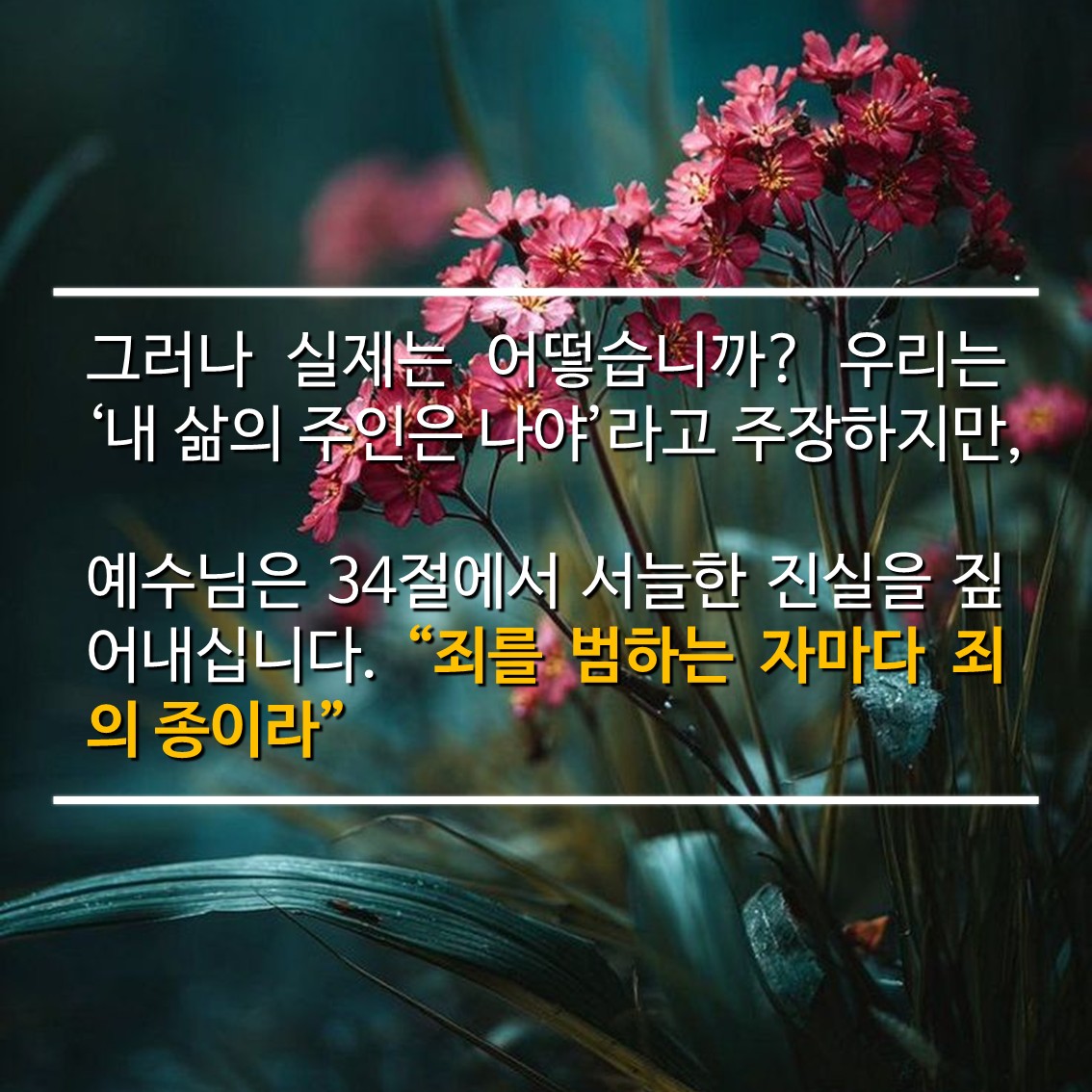 예수님은 34절에서 서늘한 진실을 짚어내십니다. "죄를 범하는 자마다 죄의 종이라"