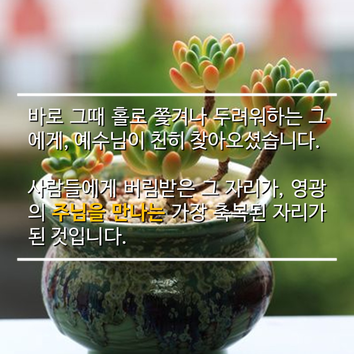 그러나 두려워하지 마십시오. 세상에서 밀려난 그 외로운 자리에, 주님이 가장 먼저 찾아와 위로해 주실 것입니다.