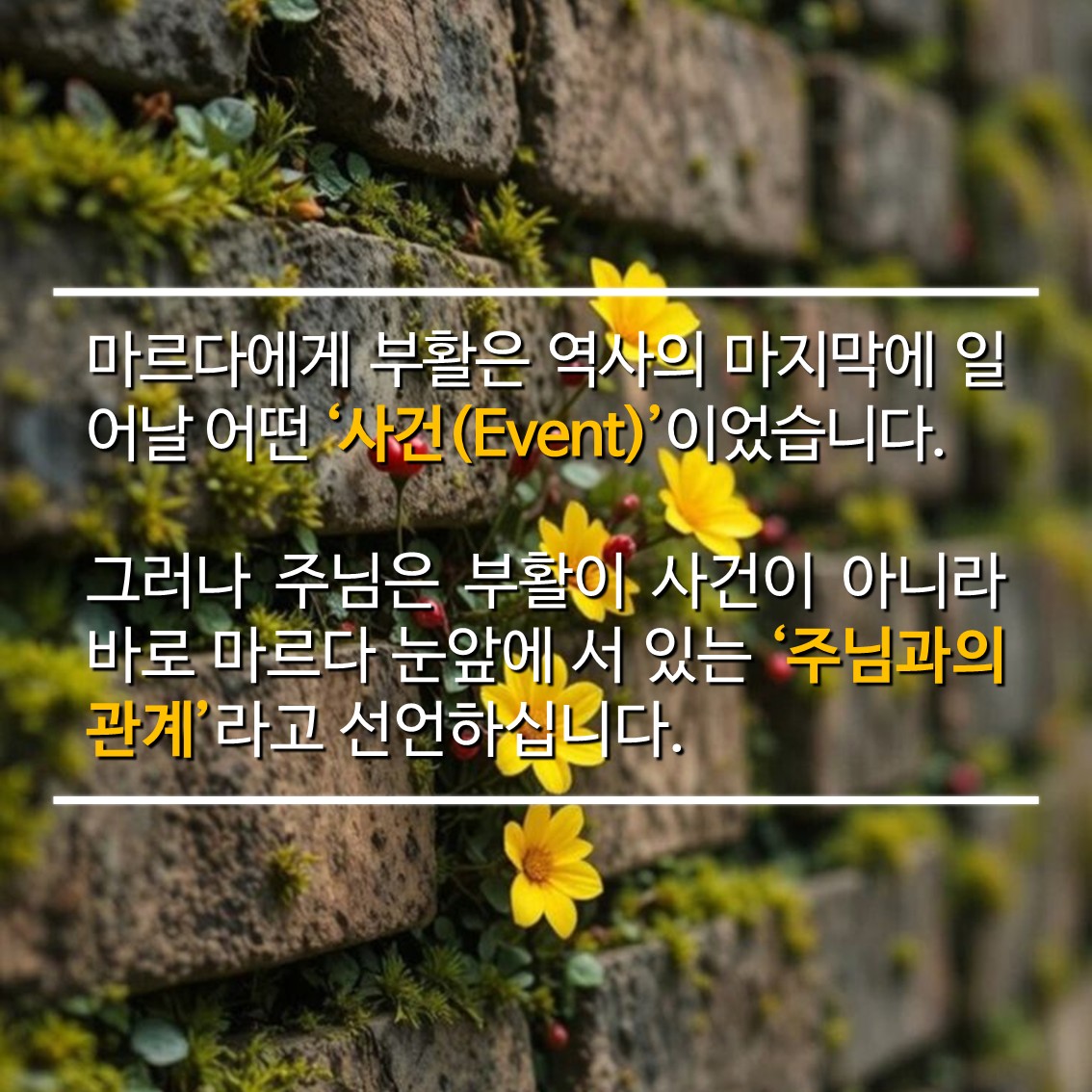 '생명'이신 주님이 마르다와 만나는 그 순간, 죽음의 탄식과 현실 회피로 가득했던 베다니의 길가는 생명이 충만한 부활의 현장이 되었습니다.